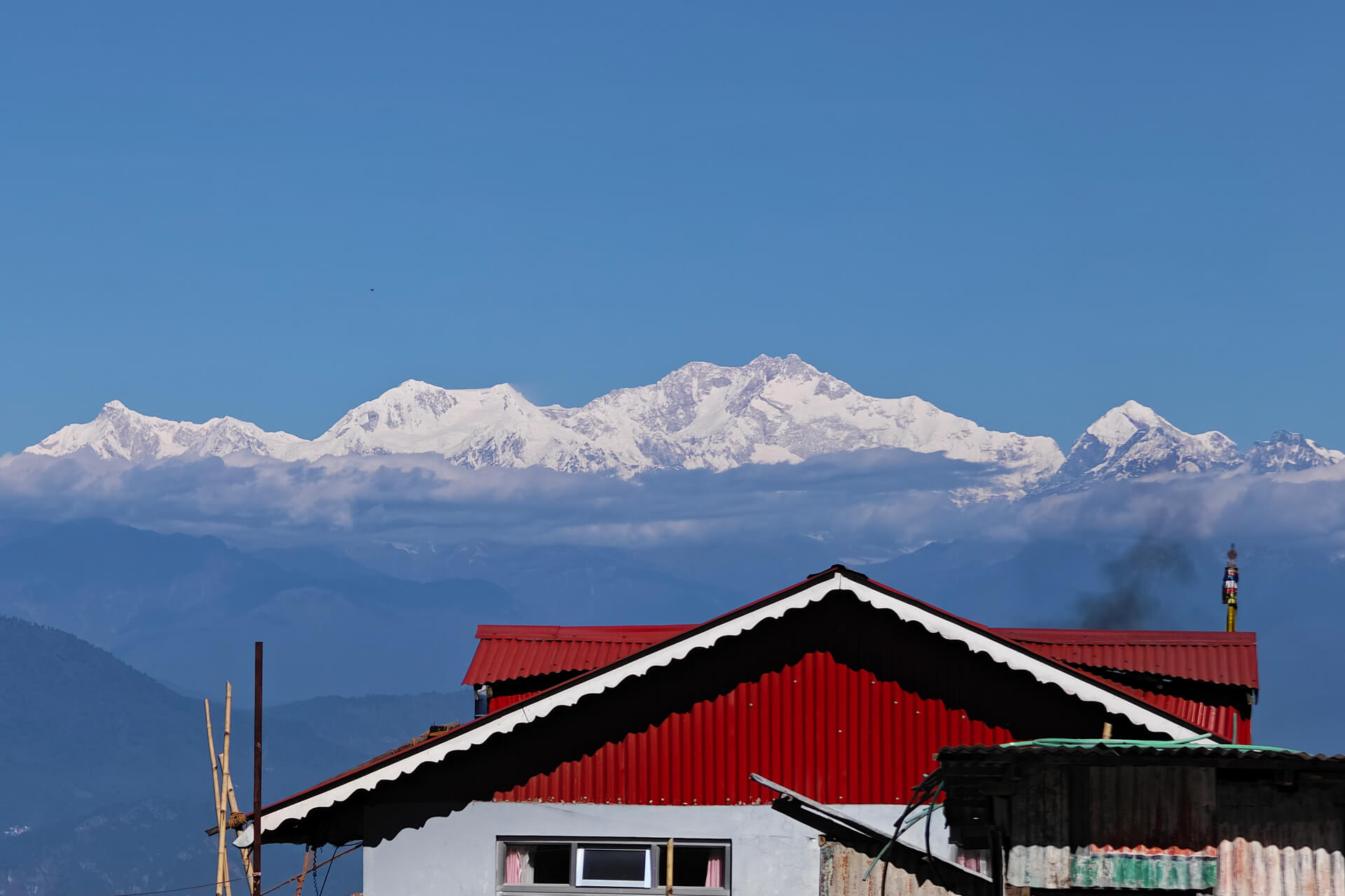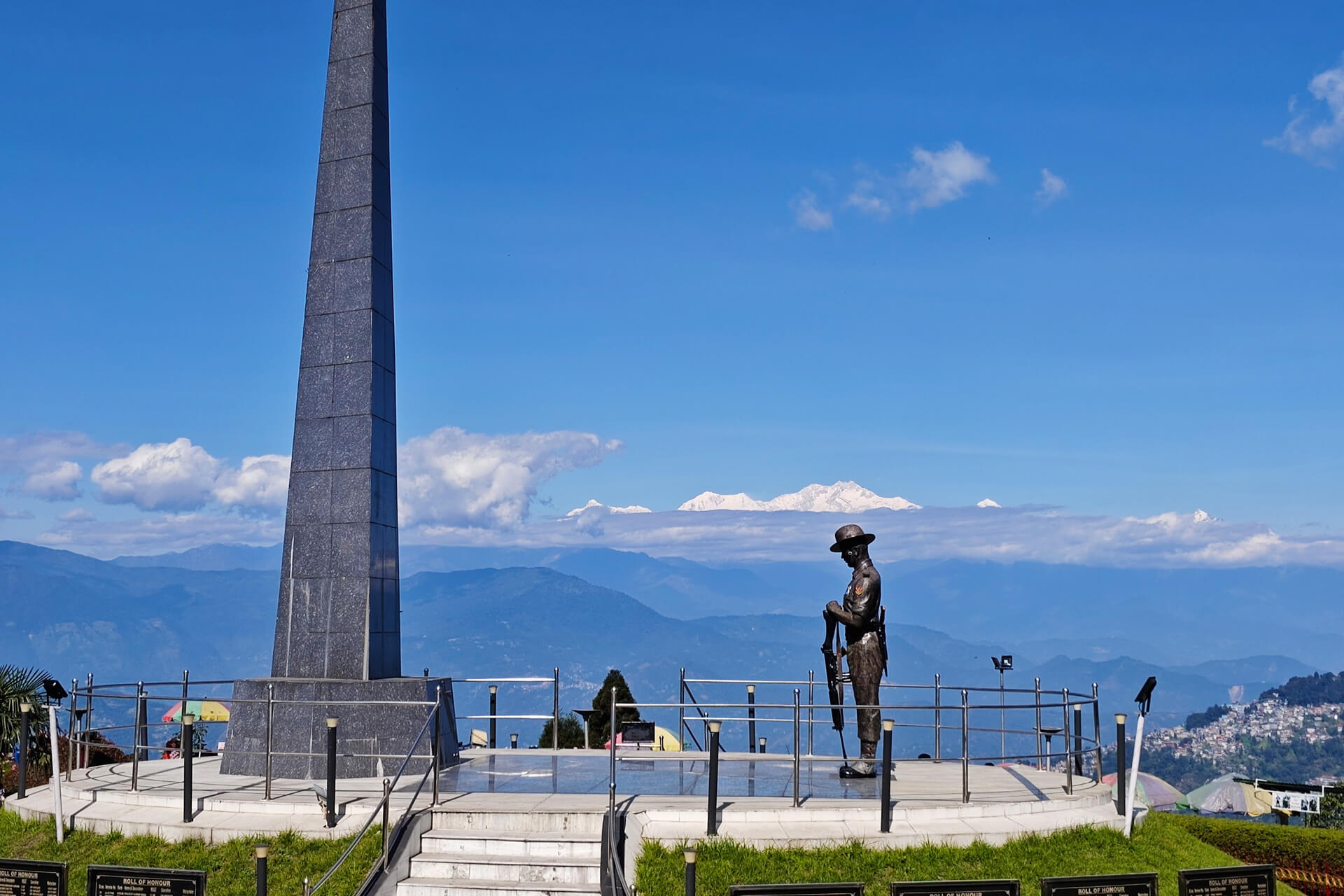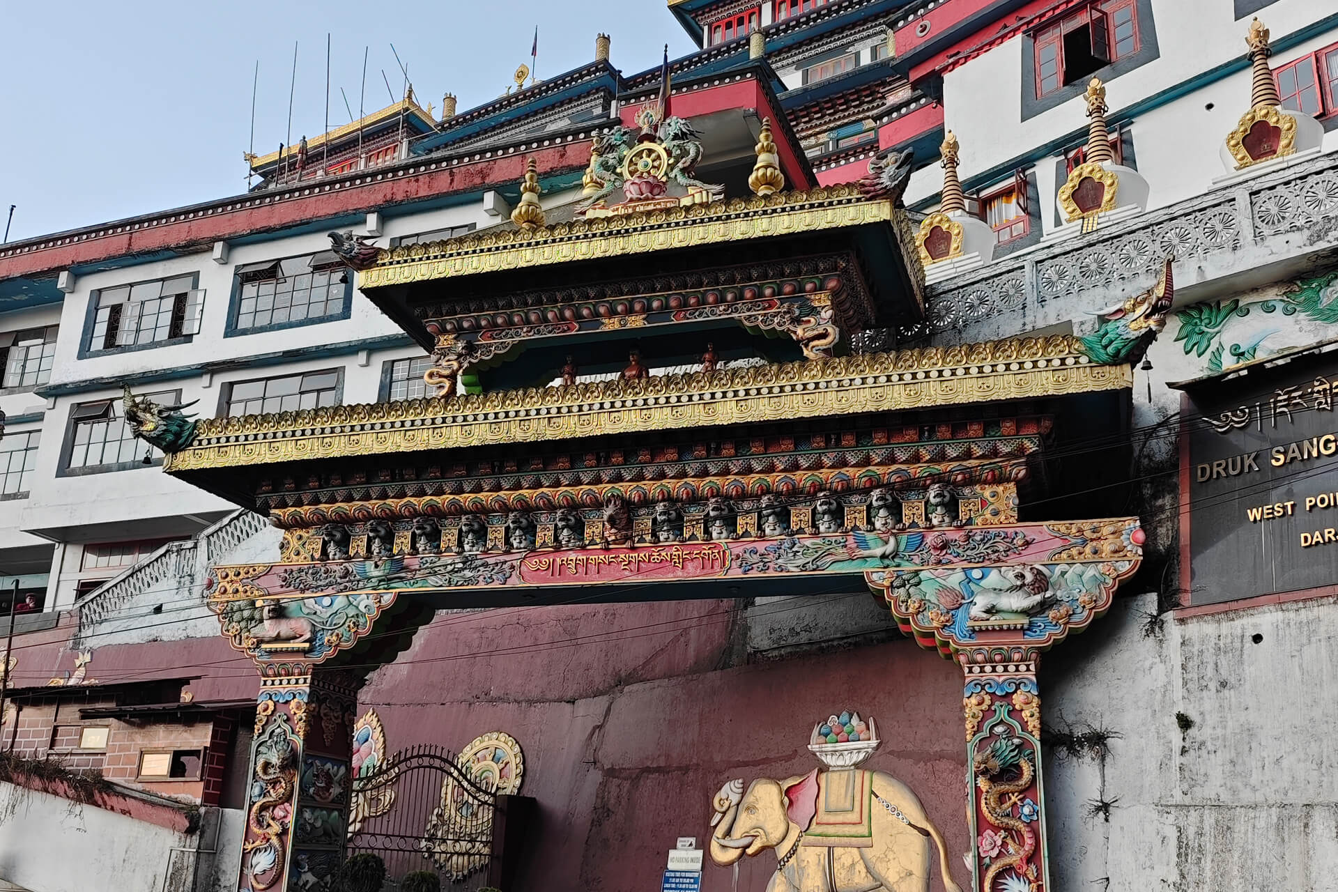 Beautiful red-and-gold architecture, prayer wheels, and a stunning hill view.
