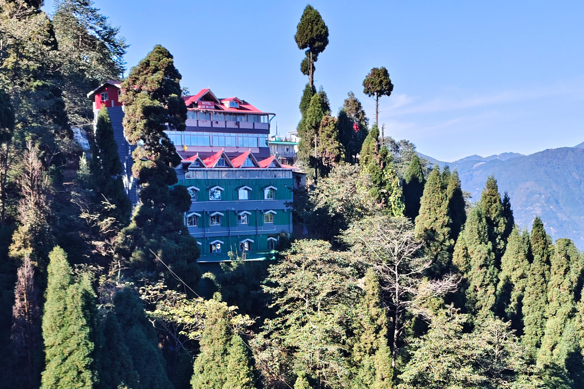 Beautiful red-and-gold architecture, prayer wheels, and a stunning hill view.